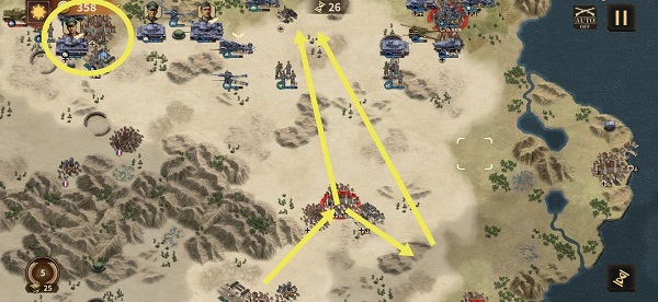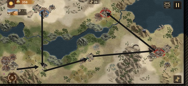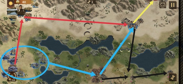 这一关的主体思路为:采用分兵策略,展开勐烈攻击,同时避开敌方防线。
