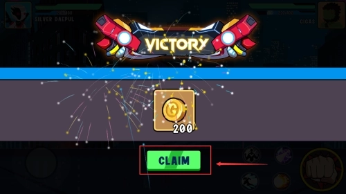 3、点击红框CLAIM绿色按钮,领取200金币战斗胜利奖励。
