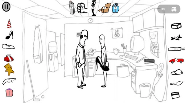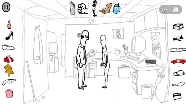 17、文件柜-员工打开一个文件柜,老板查看文件(他会一直这样做,直到你再次点击文件柜,这将触发真正的击杀),然后员工用文件柜砸向老板的头,最终他的头掉了下来。(击杀后动画:员工听音乐。)