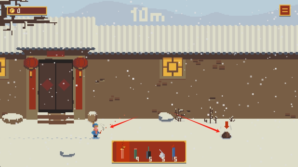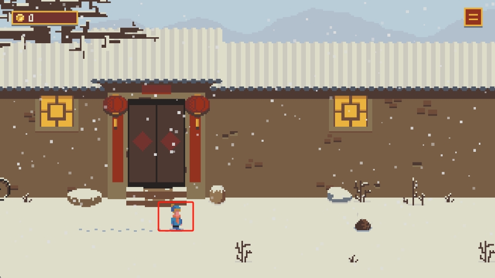 1、开始时控制红色方框内的穿着蓝色衣服的角色,在雪地庭院中移动,接近道具栏中的物品和场景元素以触发互动。
