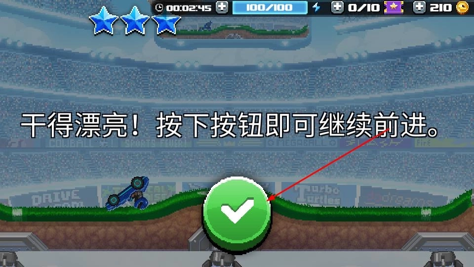 3、成功通过赛道后,点击绿色的对勾按钮进行结算,之后可以继续游戏,并解锁新的竞速关卡,挑战更加复杂的赛道。