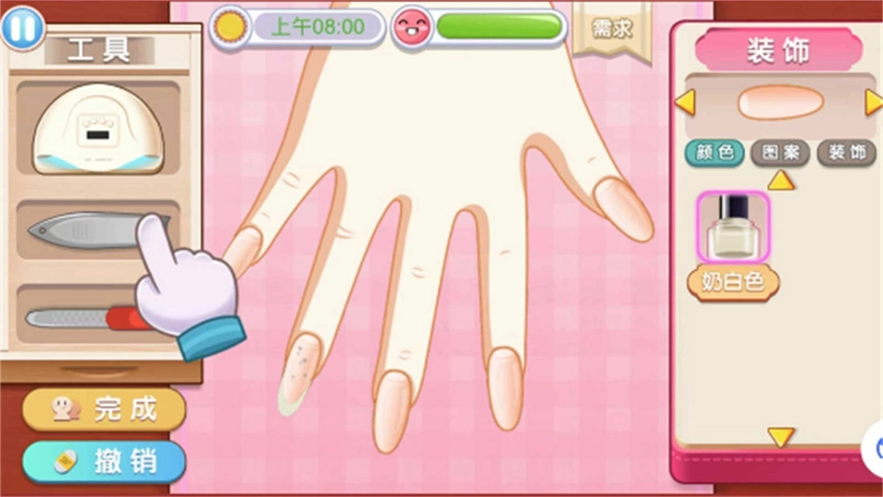 3、在美甲操作界面,左侧有多种美甲工具,右侧有装饰选项,根据需求选择合适的工具和装饰,为角色进行美甲操作,完成美甲任务。