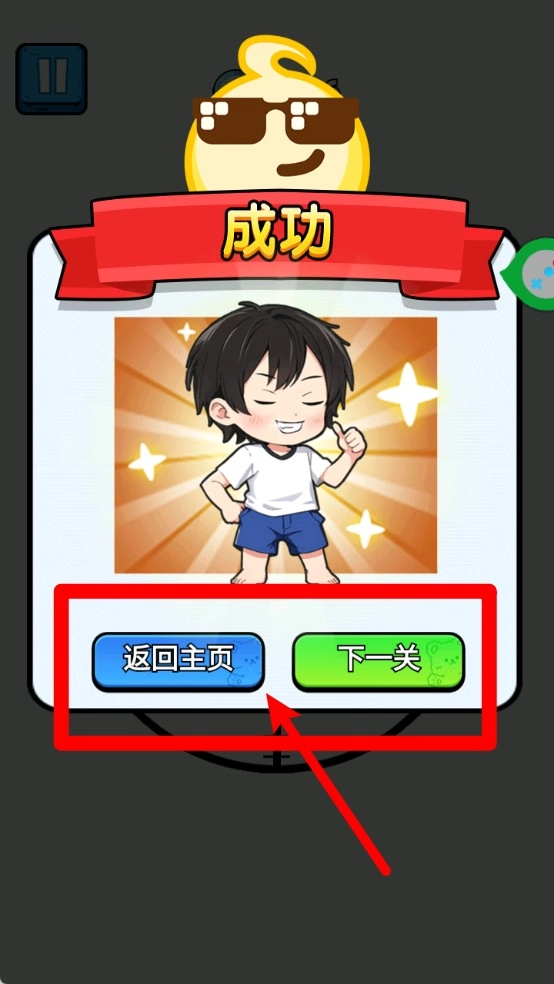 3. 当玩家完成挑战后,成功界面会呈现角色的庆祝动画。此时,玩家既能够选择返回主页,也可以点击“下一关”,从而继续开启更多饶有趣味的闯关挑战。
