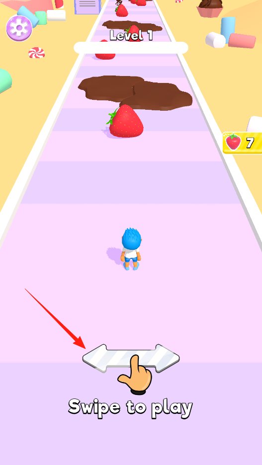 1、在蛋糕冲冲冲的起始界面,根据“Swipe to play”的提示,通过滑动屏幕来控制蓝色角色左右移动。在糖果跑道上,收集草莓并避开巧克力障碍。利用滑动操作开始闯关,享受跑酷和收集的乐趣。