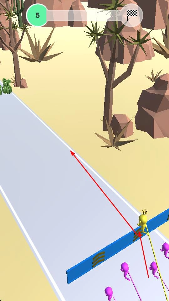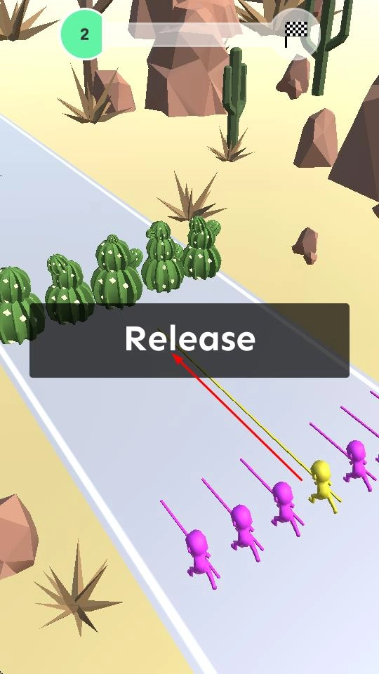 1、控制黄色小人在跑道上奔跑,跑道上有紫色小人作为对手以及各种障碍物,比如仙人掌和石块等。你需要根据Release提示来释放技能或进行操作,以超越对手。
