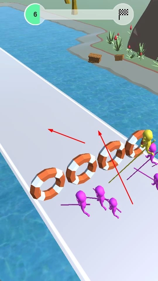 3、赛道会变得更加复杂,会出现水域、不同形状的障碍物等,继续操控黄色小人,利用技能和道具,灵活避开障碍物,超越紫色小人对手。