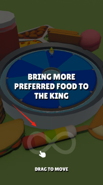 1、在喂饱国王的初始场景中,根据“DRAG TO MOVE”的提示,通过拖动屏幕来控制角色的移动。目标是收集更多国王喜爱的食物。让角色接近食物以开始收集任务,并体验这种拖动移动的机制。