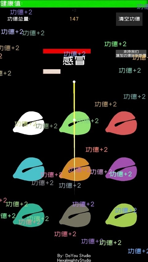 在顶部,绿色表示健康值,随着时间的推移,健康值会逐渐减少。如果健康值降为0,则视为失败。相反,持续敲击木鱼可以使健康值保持稳定。在游戏中,红色代表可能出现的身体“灾害”,连续敲击木鱼可以减轻擦伤、感冒、刀伤等各种意外情况。