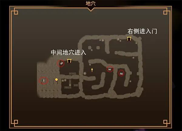 从营地右侧地穴门进入的是图上标的“右侧进入门”,穿过中间地穴也可进入此图开启左侧两个宝箱