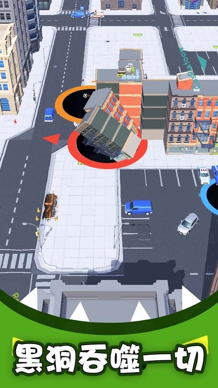 1、主要操作通过触屏拖拽实现,玩家需要精确控制黑洞的移动路径,利用其吸力吸附路途中的车辆、树木等物体,同时避开那些无法吞噬的大障碍物。