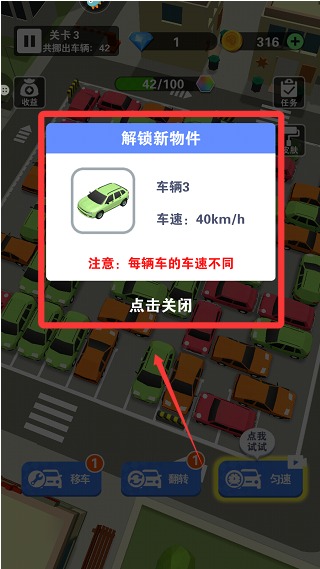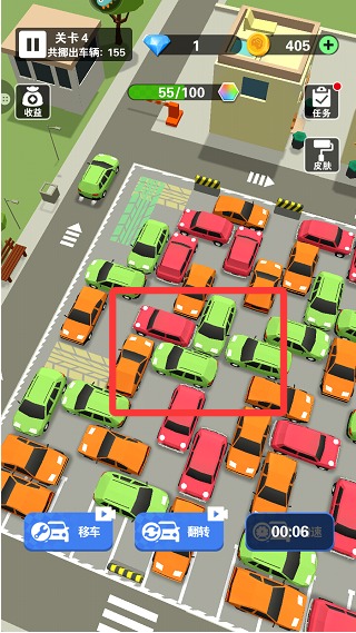 1、点击车辆就能使其移动,通过调整其他车辆的位置来为主车辆开辟一条畅通无阻的道路,确保所有车辆都能顺利离开停车场。