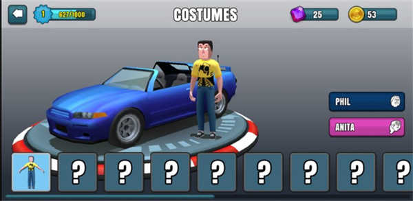 1、进入《菲利刹车记2》游戏后,在界面下方能看到换车和换装的选项,但大多需要付费。此外,第三个按钮用于选择场景,最后一个是开始按钮。