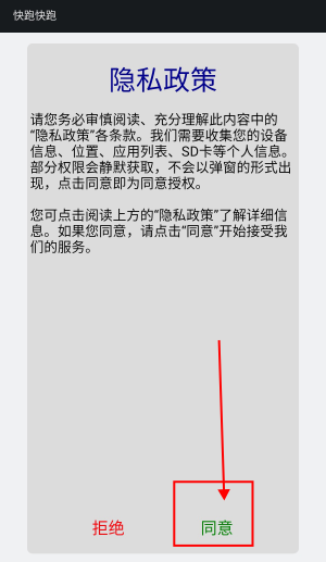 1、启动快跑快跑应用程序,然后点击“同意”。