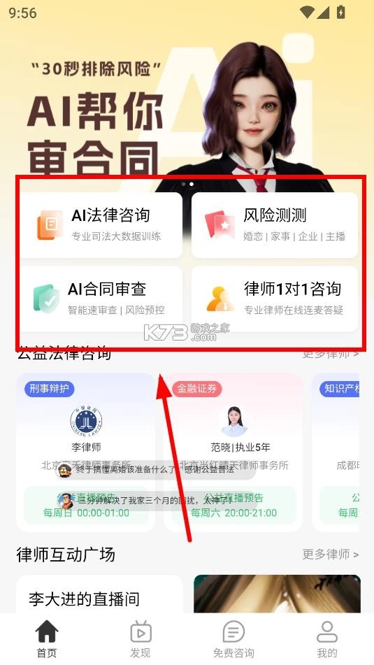 1、下载本站软件并打开,可享受AI法律咨询、风险评估、AI合同审核以及一对一律师咨询服务等。
