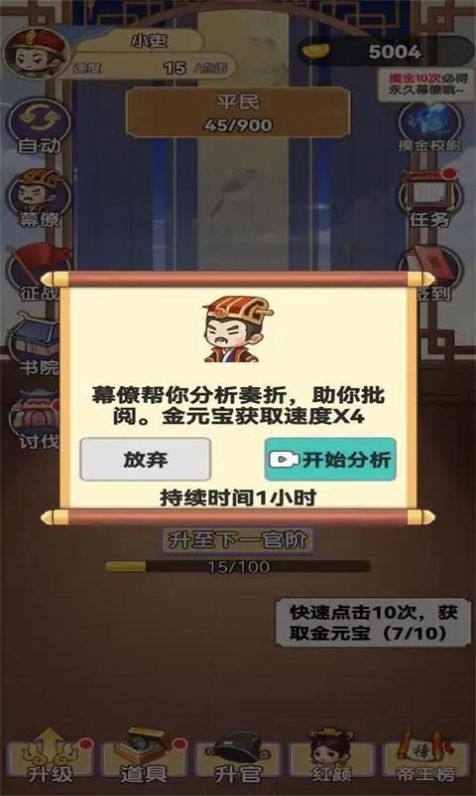 《我当帝王来寻欢》版是一款充满趣味的放置类游戏。游戏里的剧情十分刺激,总会有意想不到的事情发生。玩家的目标是实现人生的逆袭,从一文不名的乞丐,一步步崭露头角,最终成为伟大的帝王。在这款游戏中,你能体验到悬念、策略、领导力与政治智慧相互交融,助力你完成这场逆袭之旅。