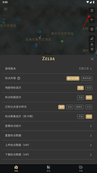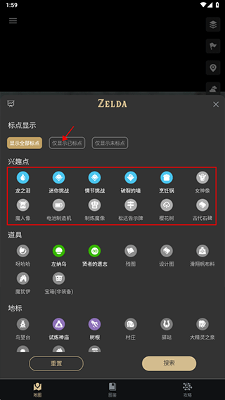 2、接着在弹出的界面中,挑选你想要找寻的各类道具点与地标,像龙之泪、清洁挑战、试炼神庙等等。
