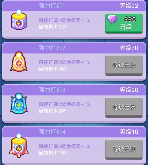 2、钻石最主要的花销就是先把强力打造升满。升满以后再管其他的。如图,这四个强力打造先都升到10级,然后是3-2-1依次升满