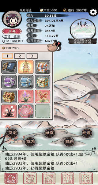 总结:此玩法思路就是尽快搞钱,靠正道功法和宠物的高金钱加成把钱路打通,之后功法宠物起来直接买修为火速飞升!