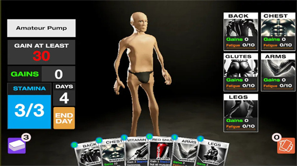 4、右侧则展示了不同部位的肌肉数量,每张卡牌能增加的肌肉量各不相同,合理使用至关重要。