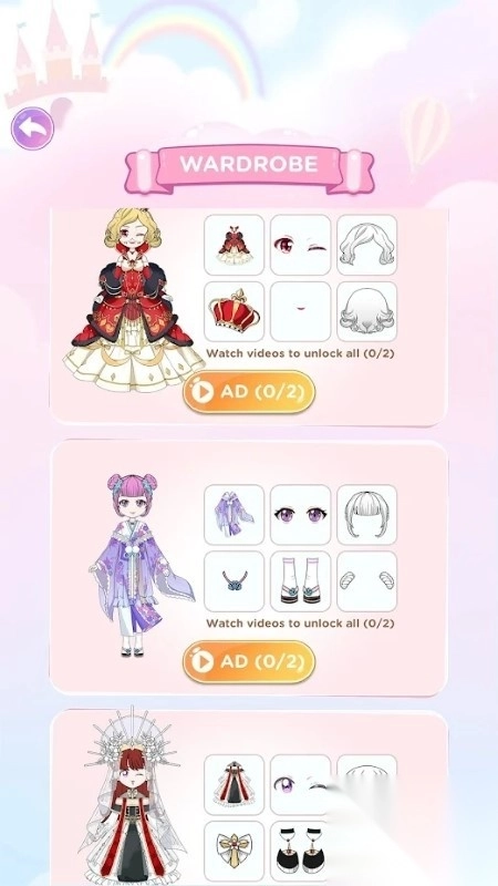 1、海量服饰库:涵盖古风、宫廷、学院等十大风格,上千件服装、发型、饰品持续更新,满足多元穿搭需求。