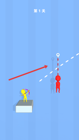 1、在第一关中,你需要控制黄色的弓箭手,对准红色的目标,计算好箭矢的飞行轨迹后射出,切断绳索,从而解救目标,完成这一关卡。