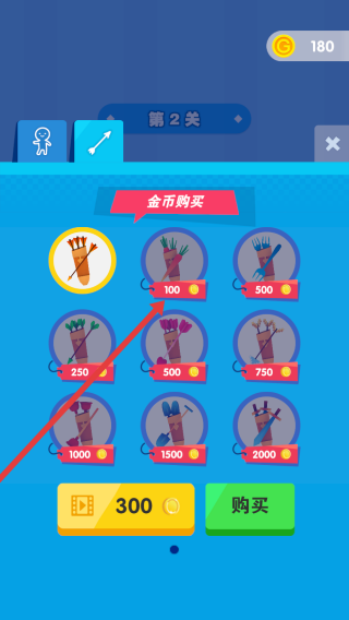 3进入商店,选择箭头所指的箭矢道具(价值100金币),点击【购买】以强化武器,为第二关的挑战做好准备。