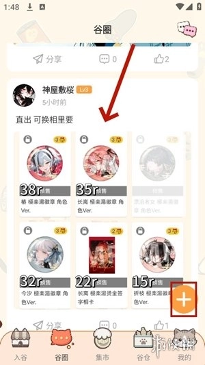 4、进入谷圈页面后,点击底部"+"号按钮即可开始发布置换帖子。