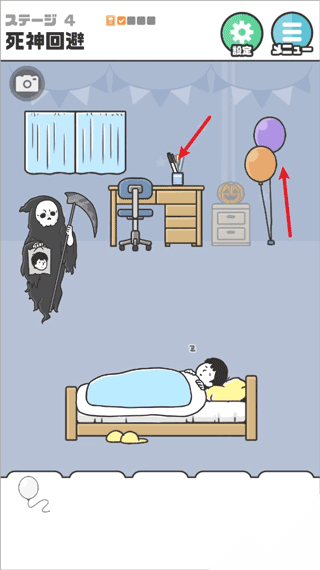 从桌子上取来马克笔和旁边的气球,把两者结合就可以得到一个画有人脸的气球。将这个人脸气球放在人的位置上,死神就会误以为那是真人而将其带走,这样就能顺利通过这一关了。