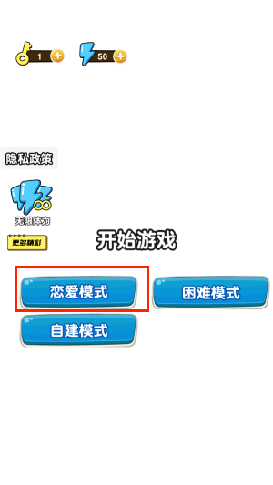 1、点击开始游戏,也可以选择其他模式比如:恋爱模式、困难模式等。