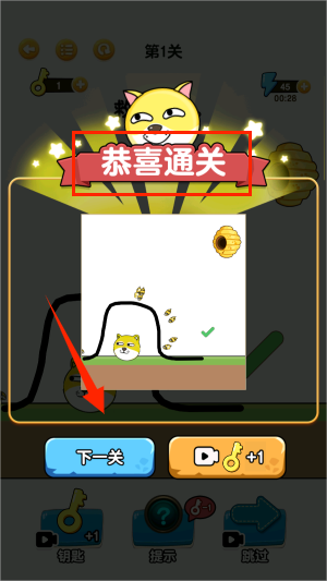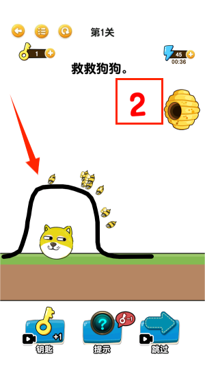 2、进入关卡后,需要通过画线阻止蜜蜂蛰到狗狗,右上方数字代表倒计时。