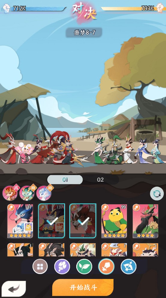 1、初期阵容搭建优先选择输出*2+辅助*1+战士*2的万金油阵容,输出可在法师和射手间进行选择,视队伍对AOE伤害或单体伤害的需求以及输出龙将的星级进行选择。前期以龙将的星级、属性为优先考虑因素,养成材料可通过重生无损返还,因此可先将初期龙将养成尽量拉高。