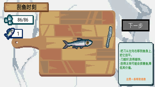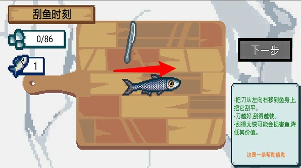 2.刮鱼操作:将刀从左向右移动,确保刀刃接触到鱼身,完成刮鱼任务。