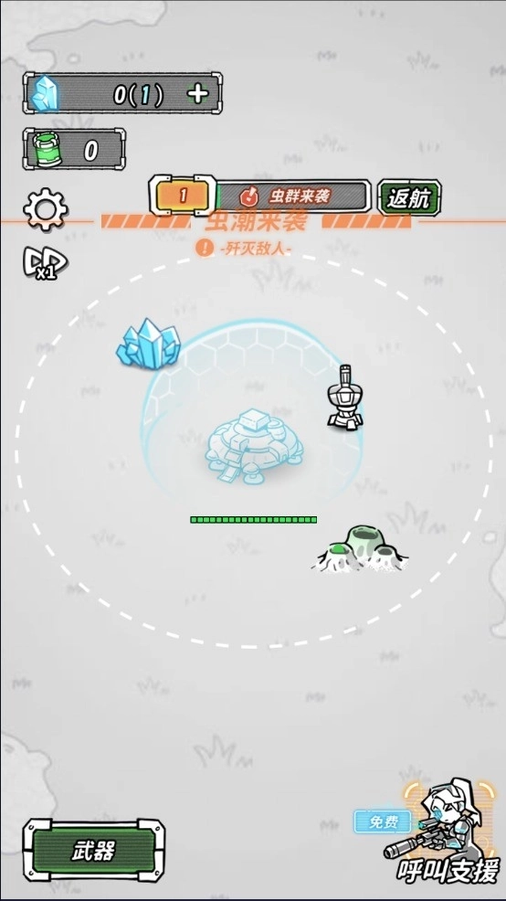 5、防御塔能够自动进行攻击,虚线表示其攻击范围。当虫潮来临,需利用防御塔来抵抗敌人的攻势。