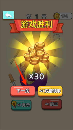 3、恭喜你帮助茄子渡过难关,获得游戏胜利,点击下一关继续挑战吧。