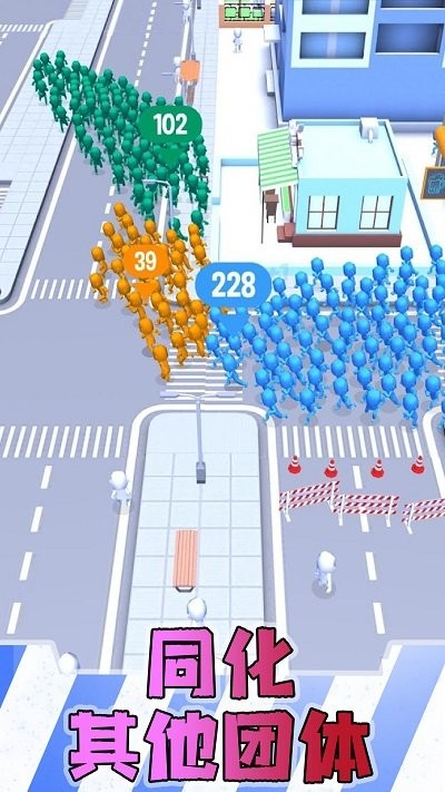 1、开局控制单个角色移动,触碰无阵营市民将其转化为己方成员,逐步壮大队伍规模。