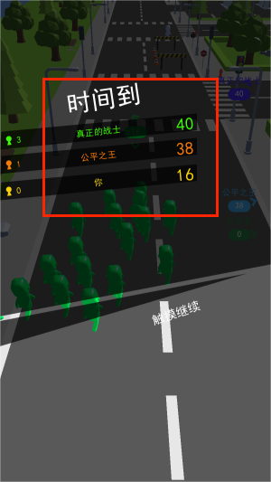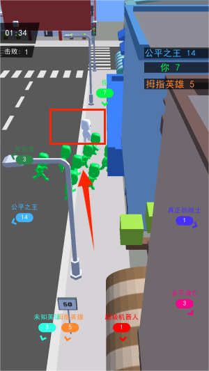 2、找到白色的小伙伴,大家集合一起前进,它会和你一样变成绿色的小人,右上角显示的是你的排名。