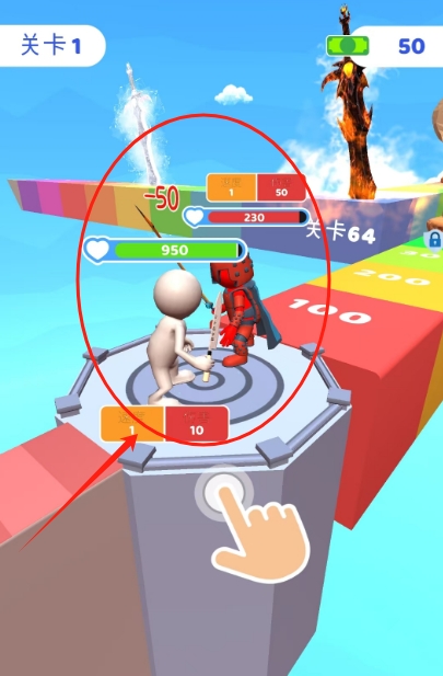 2、在前进的过程中对武器进行升级,与boss战斗时,通过快速点击来打击怪物并取得胜利。