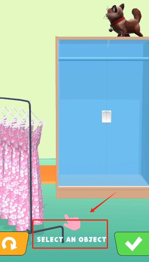 1、当看到蓝色衣柜与粉色裙子时,点击红框内“SELECT AN OBJECT”文字,即可开启衣柜整理。