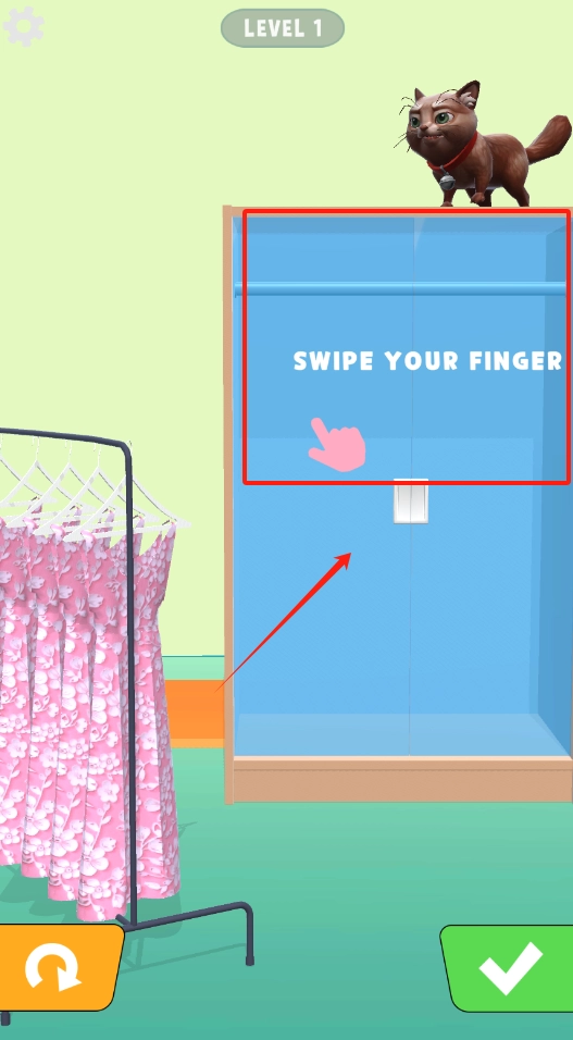 2、当看到有着浅绿色背景的衣柜时,只需用手指在屏幕上左右滑动,帮小猫把衣服分类整理妥当就可以啦。