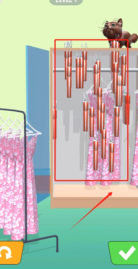 3、看到满衣柜都是粉色裙子,点击左下角的橙色箭头来切换衣物,接着按下绿色对勾,确认整理已完成。