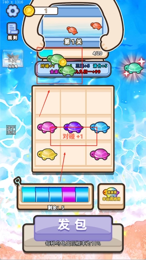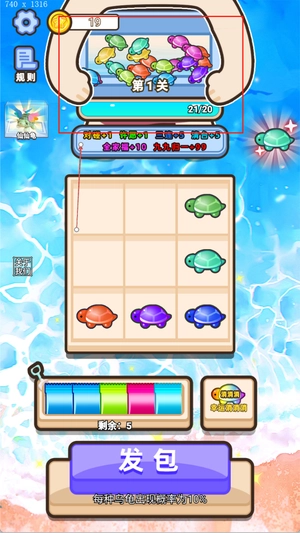 3、发包功能独具创新特色,借助特殊道具开启全新的盲盒包裹,可获取额外的乌龟图案。这一设计不仅能够增加可消除的数量,还能改变整体分布结构,进而提升通关效率。