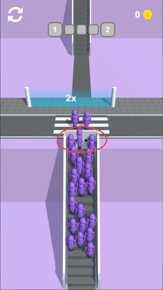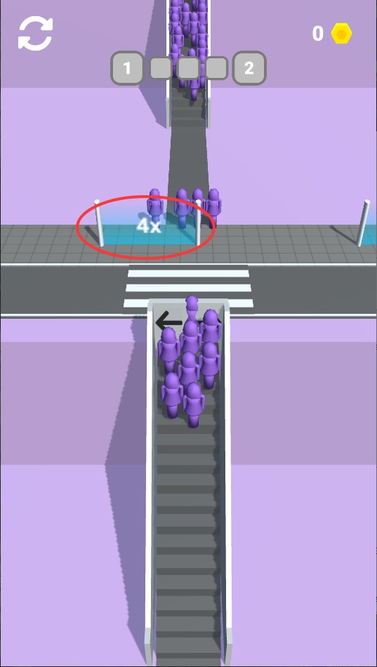 1、趣味人流控制:玩家需要引导众多小人通过扶梯,看着人群如潮水般涌动特别解压。人群碰撞的物理效果非常逼真。