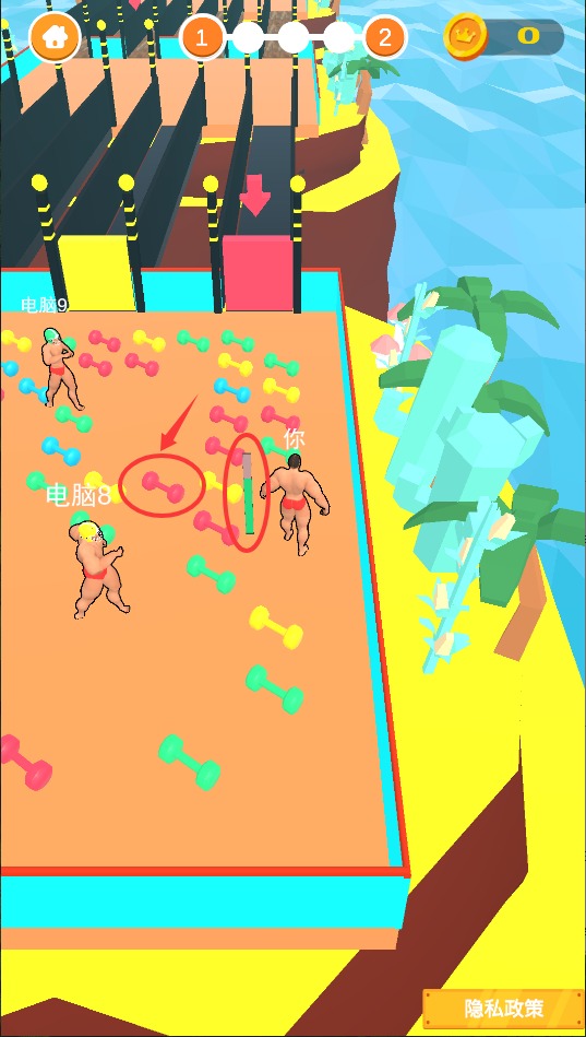 2、通过滑动屏幕来控制角色移动并收集哑铃等器械,触碰这些器材可以积累能量条,能量越高,爆发力就越强。