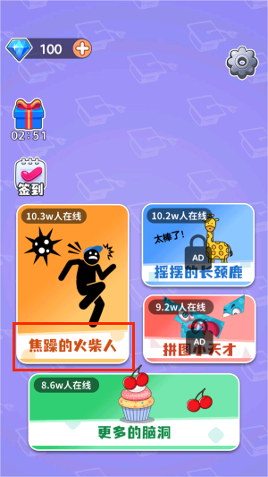 1、进入游戏后选择"焦躁的火柴人"角色,开启刺激的冒险挑战。