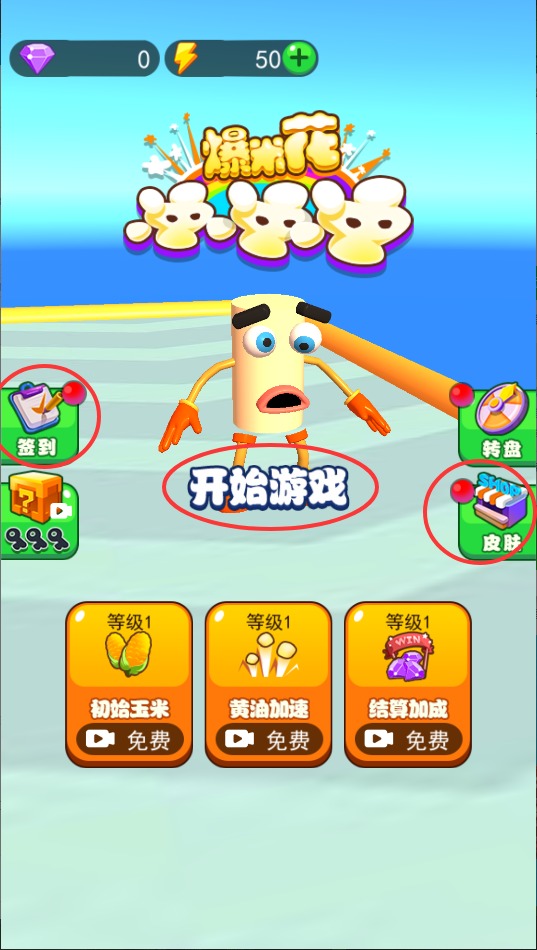 1、打开游戏先到主界面签个到,能领到各种好看的爆米花皮肤装扮,然后直接点开始就能玩。每天登录都有新奖励可以拿。