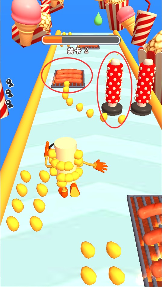 1、魔性角色设计,采用造型滑稽的爆米花小人作为主角,夸张的动作表情带来欢乐的游戏氛围。