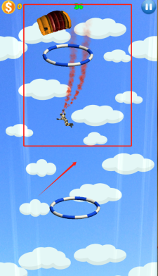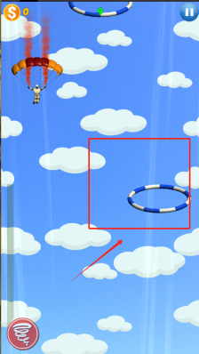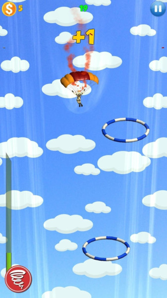 2、在游戏中,跳伞者慢慢下降,身后拖着红色的烟雾。屏幕右上角有暂停按钮,右下角的蓝白圆环是目标,需要控制角色接近并穿过它。