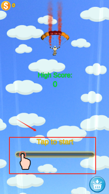 1游戏启动时,背景为蓝天白云,并有一个正在跳伞的小人。屏幕的左上角会显示金币数量为0以及最高得分为0。玩家可以通过点击下方红色框中的“Tap to start”来开始游戏。