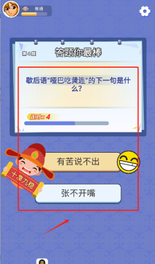 2、答题界面顶部显示当前关卡和进度条。题目是歇后语填空,选正确答案点对应卡通按钮,答对进度条会变长。