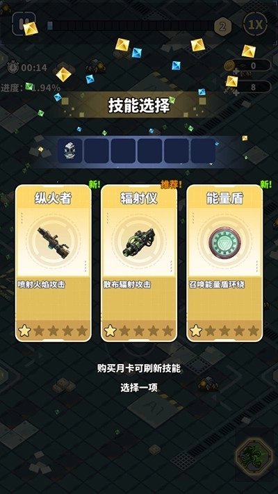 3、消灭敌人之后就会掉落绿色能量,捡取会增加经验值,经验值满了之后就可以选择技能了。